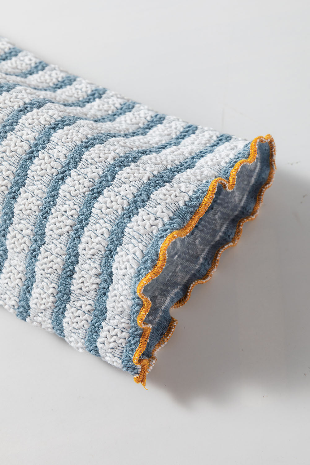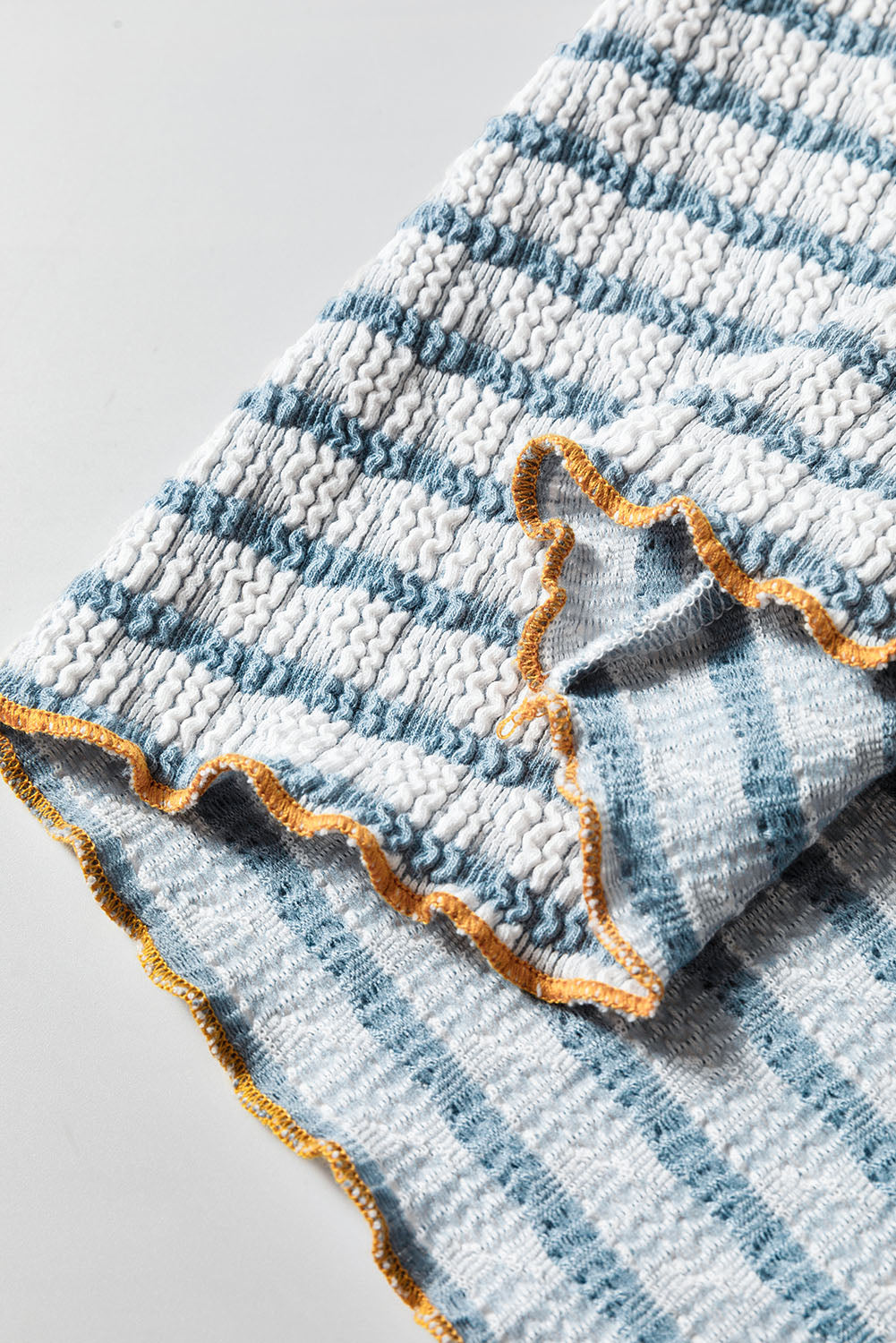 Sky Blue Stripe Textured Frilly Trim Buttons Henley Long Sleeve Top